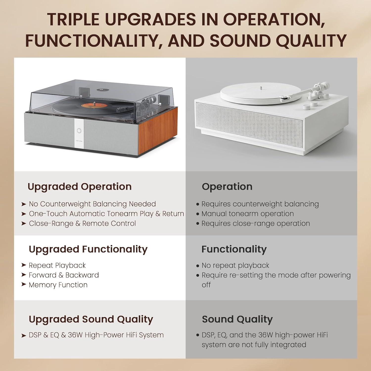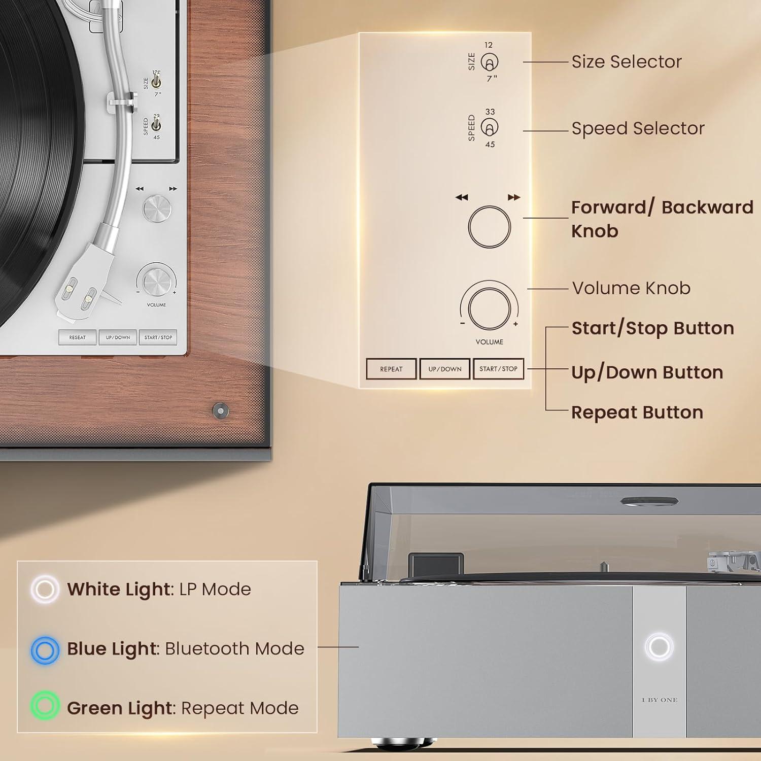 Auto Playback with Three Modes: Use Repeat function to loop one side nonstop, or use Forward and Backward for quick track navigation(note: not exact to each track). Simple controls for an easy, flexible vinyl experience