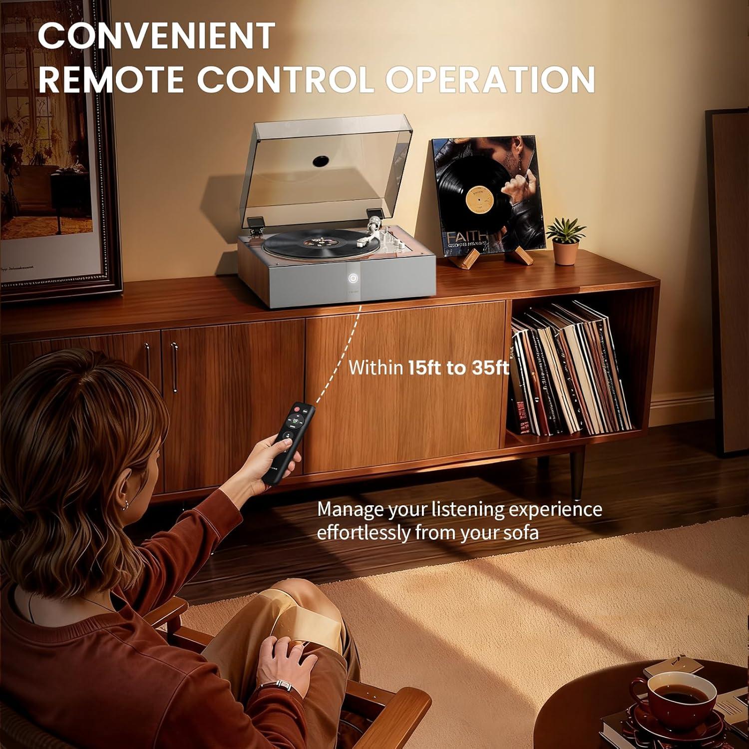 Premium Quad-Speaker Audio with DSP: Built with a refined wooden cabinet and equipped with 2×15W woofers and 2×10W tweeters. Enhanced by advanced DSP and EQ tuning, it delivers rich, full-bodied, room-filling sound with clear details, deep bass, and minimal distortion—faithfully restoring the character of your vinyl